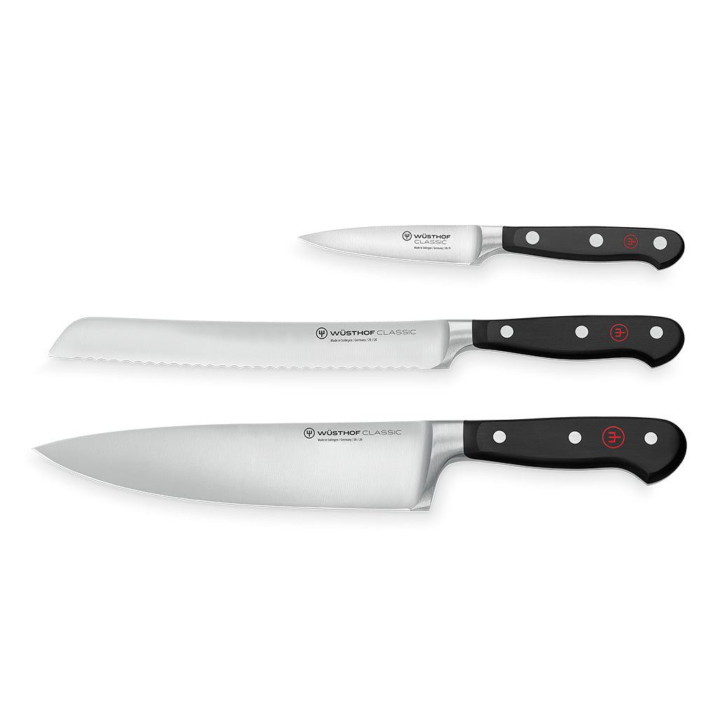 Everything you need to perform like a pro in the kitchen. With the Wusthof Classic Starter Set, you’re prepared for any task your kitchen can throw at you. The cook’s knife blade is perfect for chopping, slicing, and dicing, while the paring knife makes peeling and detail work a breeze. Your bread comes in handy for everything from slicing paper-thin tomatoes to making beautiful cuts of crusty hearth bread. Balanced, razor sharp, and ergonomic, this set is built for a lifetime of culinary adventures.