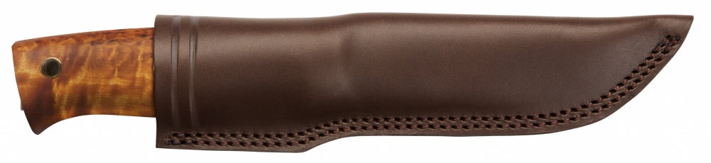 The Helle Temagami Knife is available in both a stainless steel blade and high carbon blade. This is the carbon steel Temagami - originally designed in 2011 and updated in 2012. The Temagami has a semi-full tang which provides extra strength which is often associated with bushcraft knives. The tang is exposed on both the top and pommel end, but is covered by curly Burch wood on the handle on the finger side. The drop point blade is made of triple laminated carbon steel.