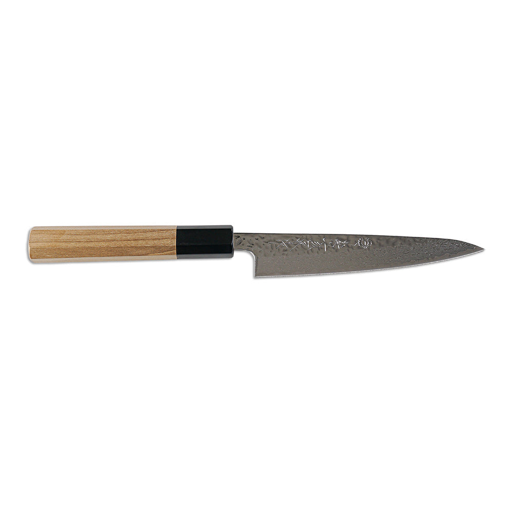 The MDT67 Series Tsuchime Petty-135mm features gorgeous 67-Layer Mirror finish Damascus. These are some of the finest blades ever made at Kikuichi. With a 67-layer, hand-hammered mirror finish they sparkle on the wall and in the hand. The lighter than average blades make your cooking prep an absolute pleasure. The Octagonal Ho-wood Magnolia handle is made by traditional handle craftsmen and recalls the old style with its water buffalo ferrule, while the AUS10 core steel is a modern material made to withstand even the longest mise en place. The MDT67 Series Tsuchime Petty-135mm features a double beveled razor sharp edge.